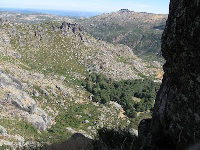 Após esta parte chegamos a uma travessiazita para a direita numa zona cheia de mato, aí progredimos para cima encostando-nos á esquerda até uma zona que tem uma árvore, montamos uma reunião na mesma e segue-se outra escalada fácil, iniciada na zona da foto a esquerda, esta zona tem um ou outro passo mais aéreo, mas as quedas são pequenas 5 ou 6 metros na pior das hipoteses antes de torcermos os tornozelos nos calhaus em baixo. Temos umas plaquetes nesta zona que facilitam grandemente a progressão.Esta zona segue até á zona da bifurcação por um caminho que alem de caminhada oferece um ou outro obstaculo sem grande dificuldade ou exposição.